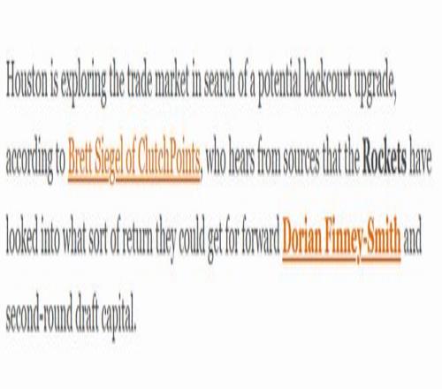 北京时间1月23日,据名记西格尔报道,休斯顿火箭队正试水交易市场,寻求补强球队后场实力。消息人士透露,火箭方面已在评估,若将锋线球员芬尼-史密斯与次轮选秀权作为筹码,能够换回怎样的交易回报